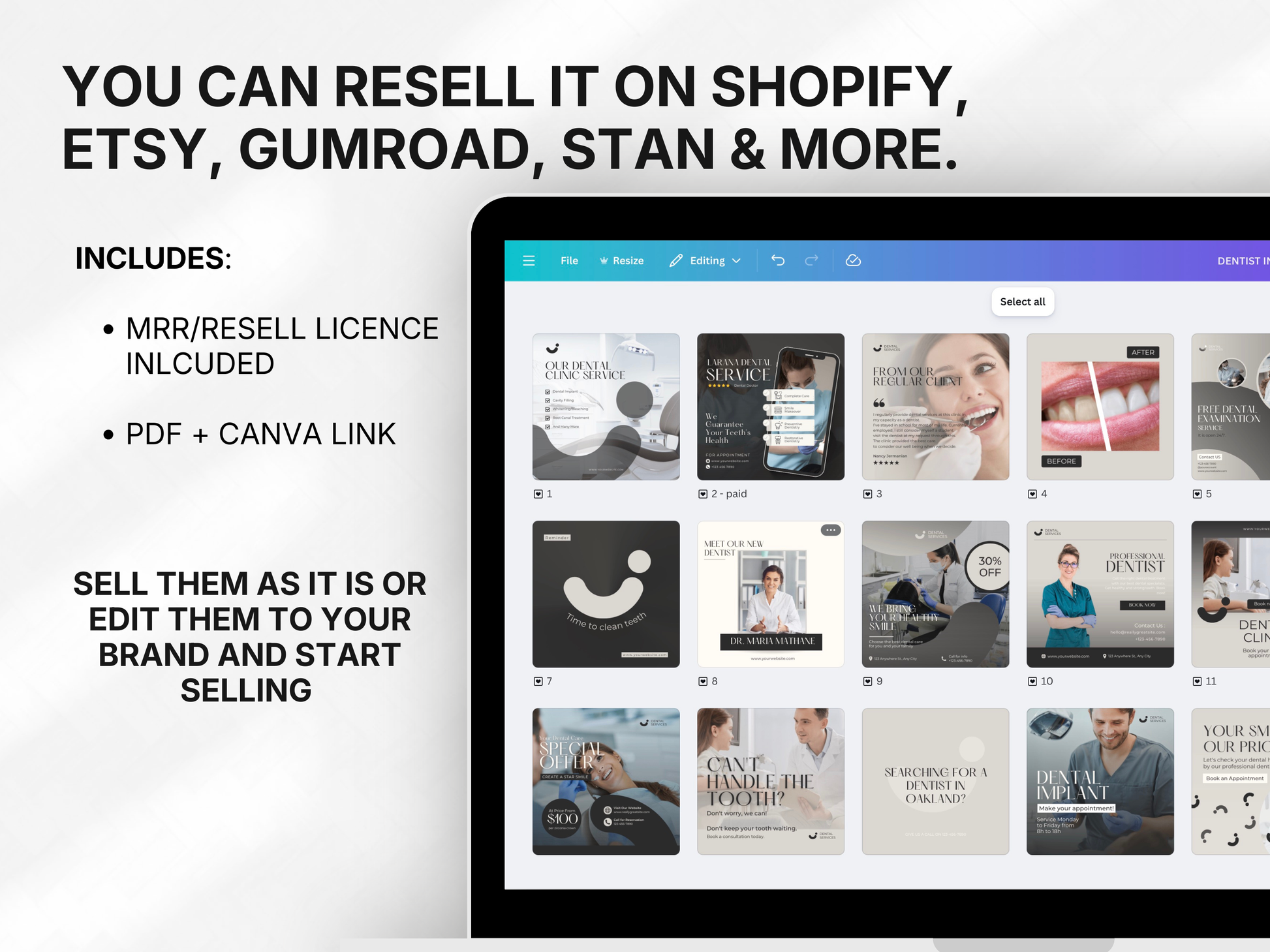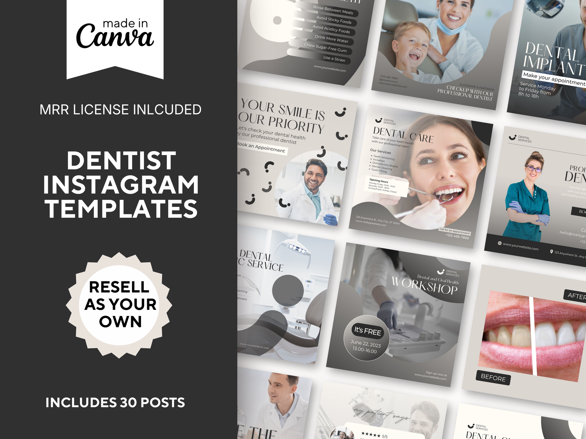 The Resell Empire 30 Dentist Instagram Templates pack is a professionally designed social media content system created specifically for dentists, dental clinics, orthodontists, and aesthetic dental practices who want to look modern, professional, and trustworthy on Instagram — without hiring a designer or wasting time on Canva.