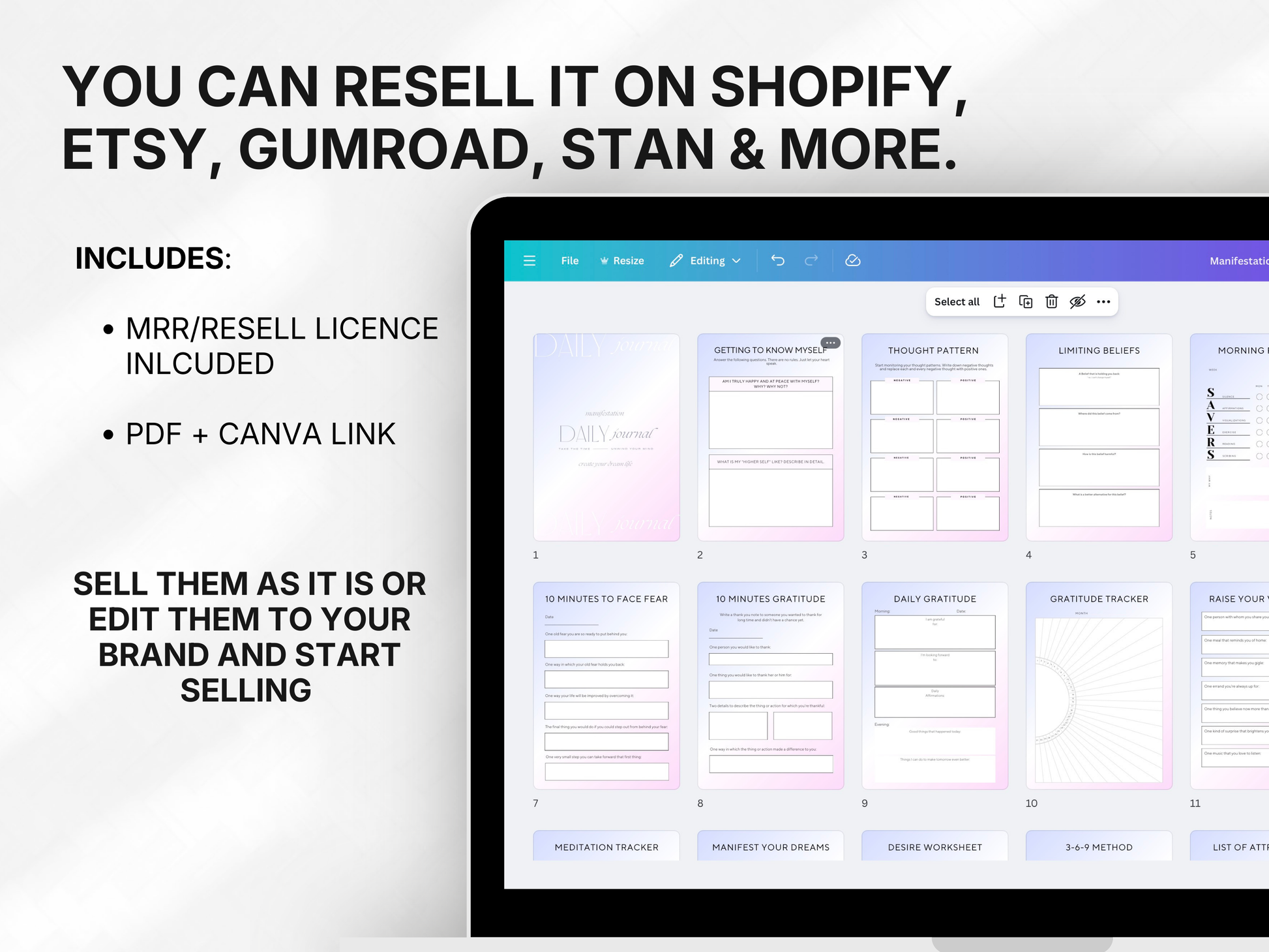 The Resell Empire Manifestation Planner is a beautifully structured 63-page digital journal designed to help you reprogram your mindset, raise your vibration, remove blocks, and consciously create the life you desire — while also giving you the power to resell it as your own product.
