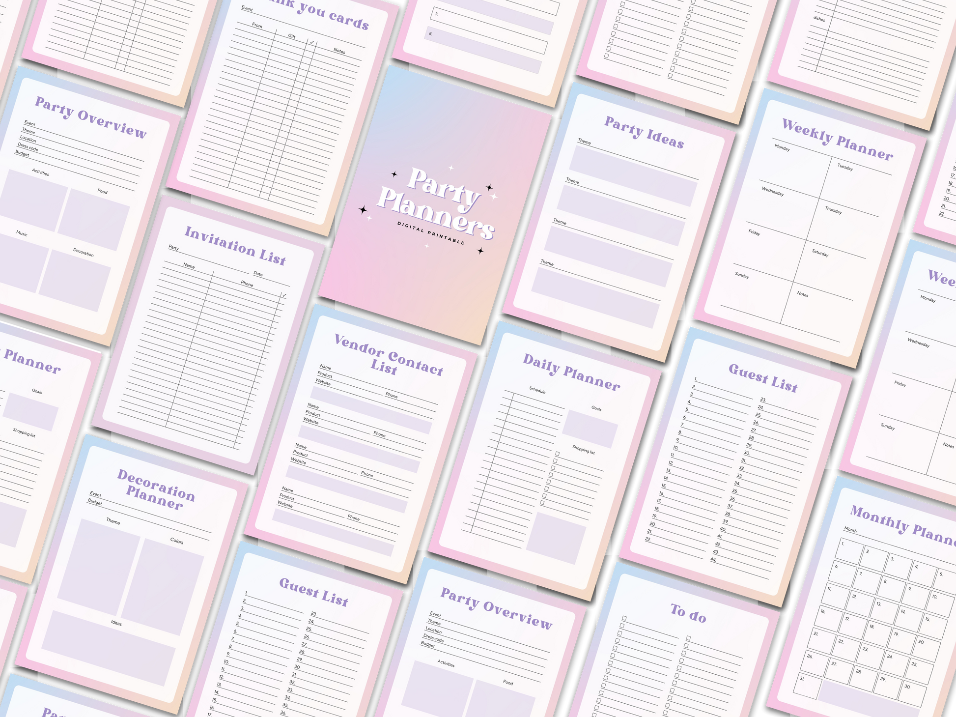 This is a digital, printable party-planning workbook that walks you through every step of planning a successful event — from the first idea to the thank-you cards after the party.